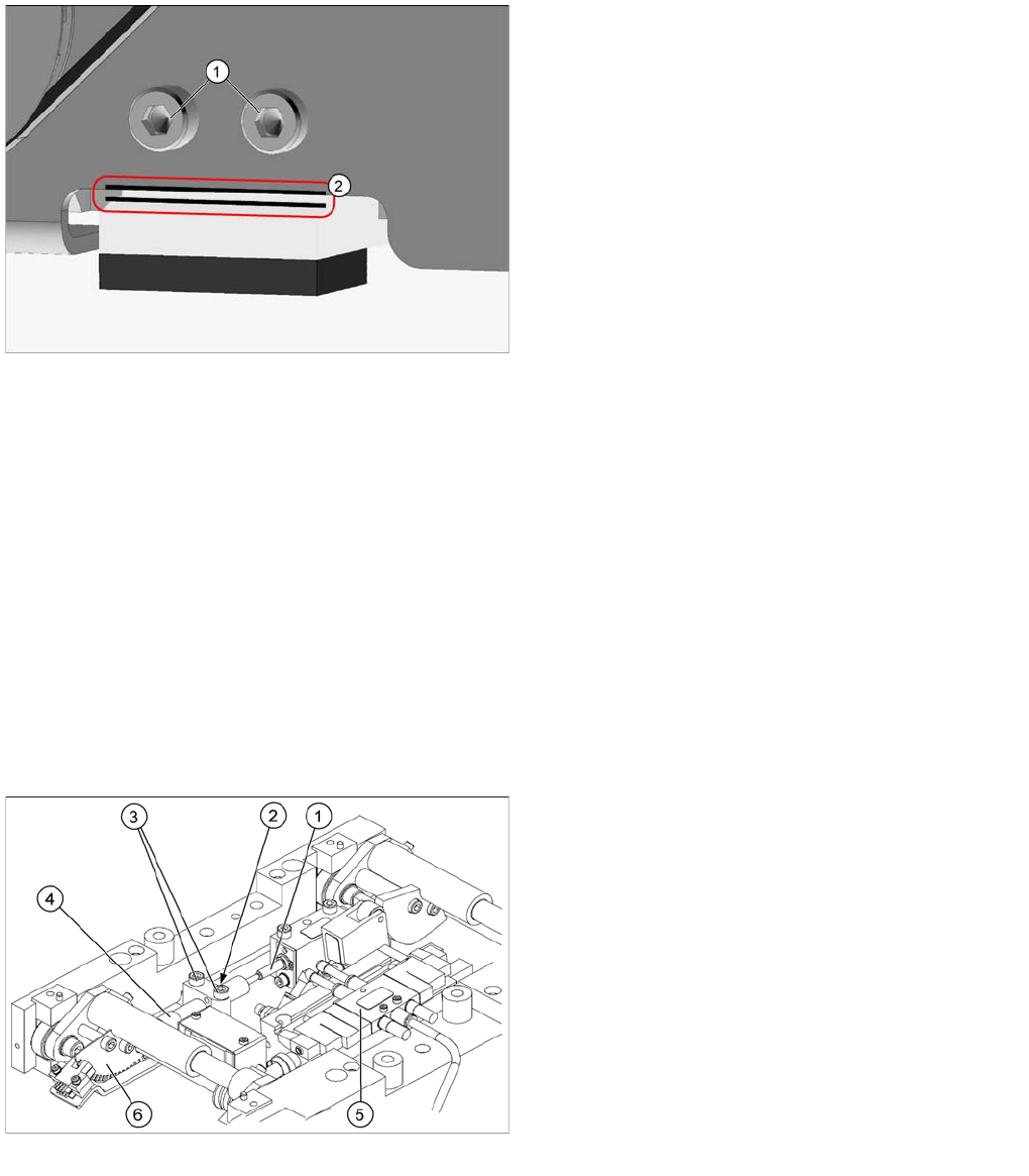 ► With the aid of a 0.1 mm feeler gauge, check the gap between the conveyor belt and the clamp (see