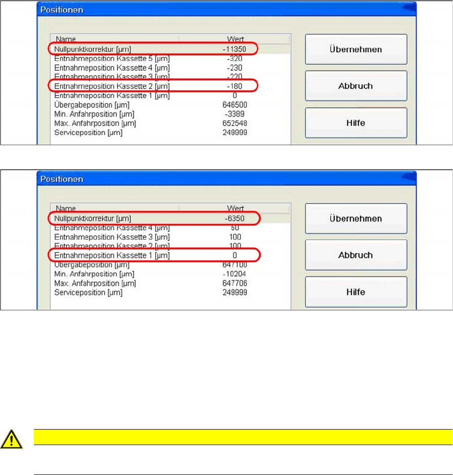 correction line of the machine data. In the Position of removal Position cassette 1 line,