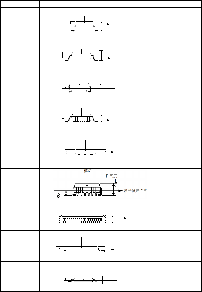 第 2 章 制作生产程序 (4) 激光高度 设置激光定中心时的测量高度。输入从吸嘴顶端到激光照射到的测量位置的距离。 虽然根据元件高度与元件种类自动决定初始值,但有时不同的元件 ( 激光测定位置为圆筒形或 透明时等 ) ,需要改变初始值。请设置可进行稳定识别的高度。 ◆ 默认值 激光高度的默认值有时根据元件的种类 和高度来设置。下表给出了元件种类和激光高度的默 认值的关系。 表 2-3-5-2-5- 1 元件种类和激光高度的默 认值的关…