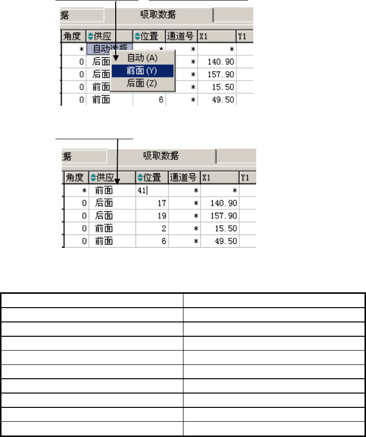 设置“前面”或“后面”后,即可输入“角度”、“位置”、“通道号”(仅限管状送料器)