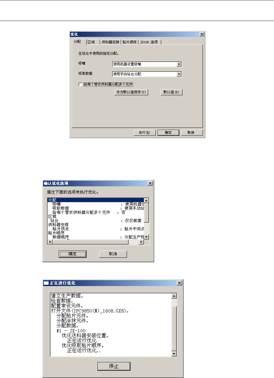 第 2 章 制作生产程序 2-4-2 执行优化 2-4-2-1 执行优化 ( 1 )在优化条件设置画面中,按下“执行”按钮,开始优化处理。 图 2-4-2-1-1 优化 ( 2 )显示“确认优化选项”画面。 1 )单击“确定”后,进行优化。 2 )显示正在进行优化的画面。 2- 89