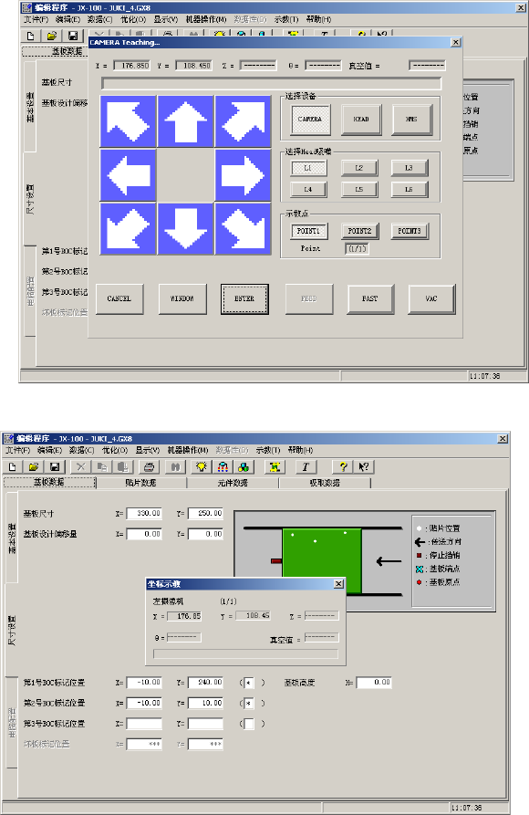 第 2 章 制作生产程序 2-5-2-7 坐标的示教 2-5-2-7-1 基本操作方法 本节将说明坐标示教的基本操作方法。 < 步骤 > ① 将光 标移动到想要示教的数据位置。 图 2-5-2-7-1- 1 坐标示教 (1) ※ 当为 XY 轴示教时,只要在 X 、 Y 其中 1 个位置进行示教, X 、 Y 轴两个坐标都可自动输入。 ② 请按 示教按钮或 HOD 装置选择键,选择 示教使用的装置 ( CAMERA 等 ) …
