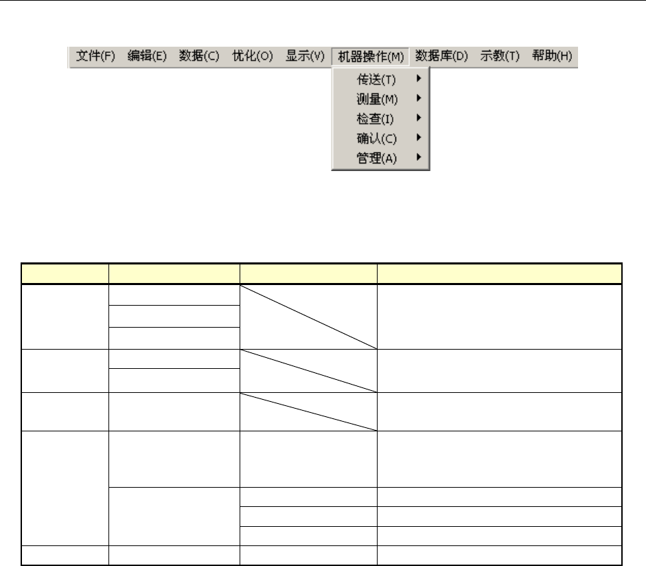 第 2 章 制作生产程序 2-5-4 机器操作 操作主机的动作,执行各种作业。菜单上分成各种作业项目。 图 2-5-4- 1 选择机器操作的画面 各项菜单项目及子菜单的功能概要。 菜单项目 子菜单 1 子菜单 2 概要 传送 基板搬入 将基板搬入或搬出主机。 基板搬出 HMS 夹紧 测量 单独 测量元件数据的各项详细值。 连续 检查 确认速度功能 进行模拟生产 , 检查运行中的 XY θ 偏 移量。 确认 标记类 BOC 确认 BOC …
