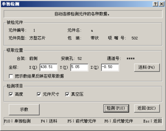 在单独检测过程中,显示如下画面。显示正在进行单独检测的元件的内容及吸取位置,