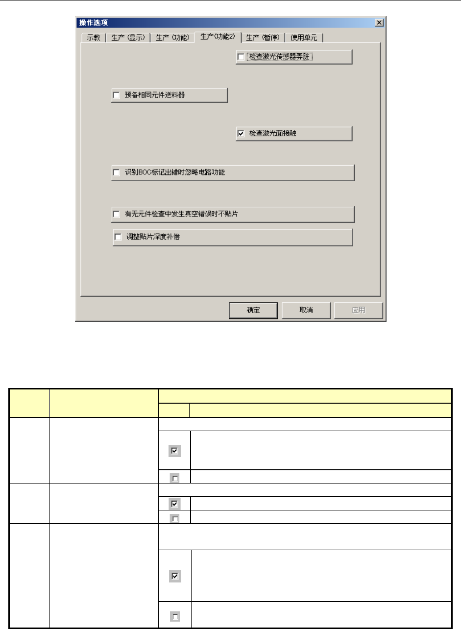 第 4 章 其他功能 4 识别 BOC 标记出错时, 忽略电路功能 生产中若查出电路 BOC 标记错误时, 则对该电路不 进行元件贴片而 继续生产。 设置坏板标记识别后, 将优先处理坏板标记识别结果, 因此查出 BOC 标记错误后将跳过该电路,不进行贴 片。 识别 BOC 标记出错时,忽略对该电路的贴片。 只作为识别 BOC 标记出错进行正常处理。 5 检查激光面接触 设置是否进行激光面接触的检查。 (505 吸嘴以上 ) 激光面接触检…