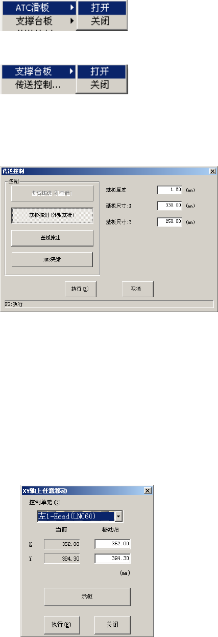 第 4 章 其他功能 (1) ATC 滑板 控制 ATC 滑板的打开、关闭。 ( 2 )支撑台板 控制支撑台板的打开、关闭。 (3) 传送控制 控制基板的搬进、搬出动作。 请先按 [ 基板搬进 ] 、 [ 基板搬出 ] 或 [HMS 夹紧 ] 按钮指定动作,再按 [ 执行 ] 按钮。仅 JX - 100 LED 具有 HMS 夹紧功能。 图 4-6-3- 2 传送控制对话框 (4) XY 轴移动 将所选单元移动到选择的位置。 菜单中无法…