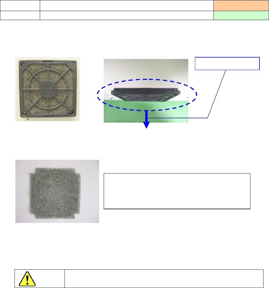 第 5 章 日常检查 ( 1 )拆下风扇马达的过滤器。 将黑色树脂的部分向面前拉,即可拆下。 风扇马达 机器侧面 ( 2 )用除尘器吸去过滤器的灰尘。 风扇过滤器 ( 3 )把过滤器装回去。请确认风扇运转是否正常。 清扫位置 5-3-11 风扇马达过滤器 实施频度 : 每月 清扫内容 清扫过滤器的灰尘、异物 使用工具:吸尘器 注意 因风扇高速旋转,在接通电源的状态下进行作业有危险。要进行作业时, 请务必切断电源。 无法去除脏污时,请更换…