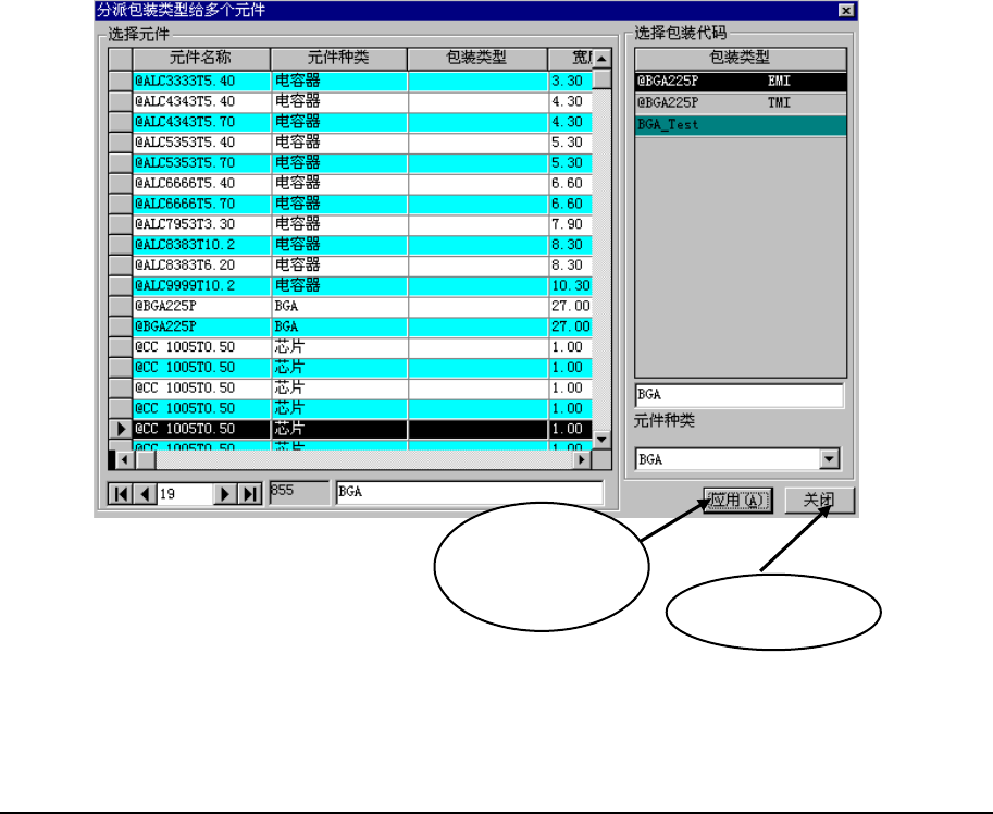 4) 选择元件数据和包装类型、“应用”按钮后,可把包装类型分派到所选择的元件数据上。