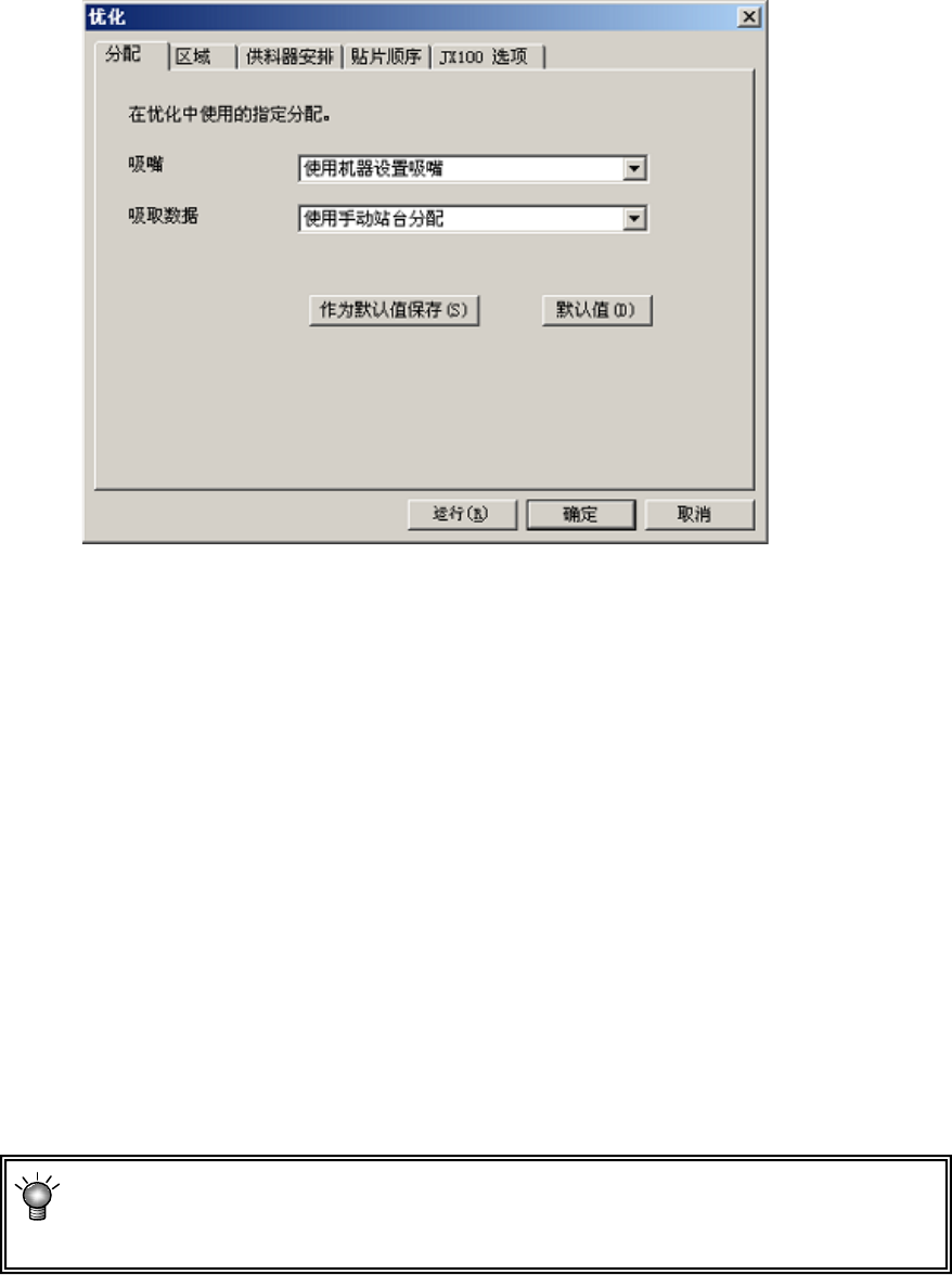 第 2 章 制作生产程序 ( 2 )区域 指定配置送料器的区域。 可将所有的送料器只配置在前面或后面。 图 2-4-1-2- 3 优化 注:不使用“站台” 。 ●两面 :在整个区域的送料器台上配置送料器。 ●仅仅前面 :仅在前面的送料器台上配置送料器。 ●仅仅后面 :仅在后面的送料器台上配置送料器。 ●前面优先 :优先在前面的送料器台上配置送料器。 ●后面优先 :优先在后面的送料器台上配置送料器。 2- 84