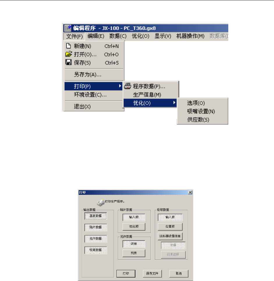 选择“文件”/“打印”,从“程序数据”、“生产信息”、“优化”中选择要打印的项目。