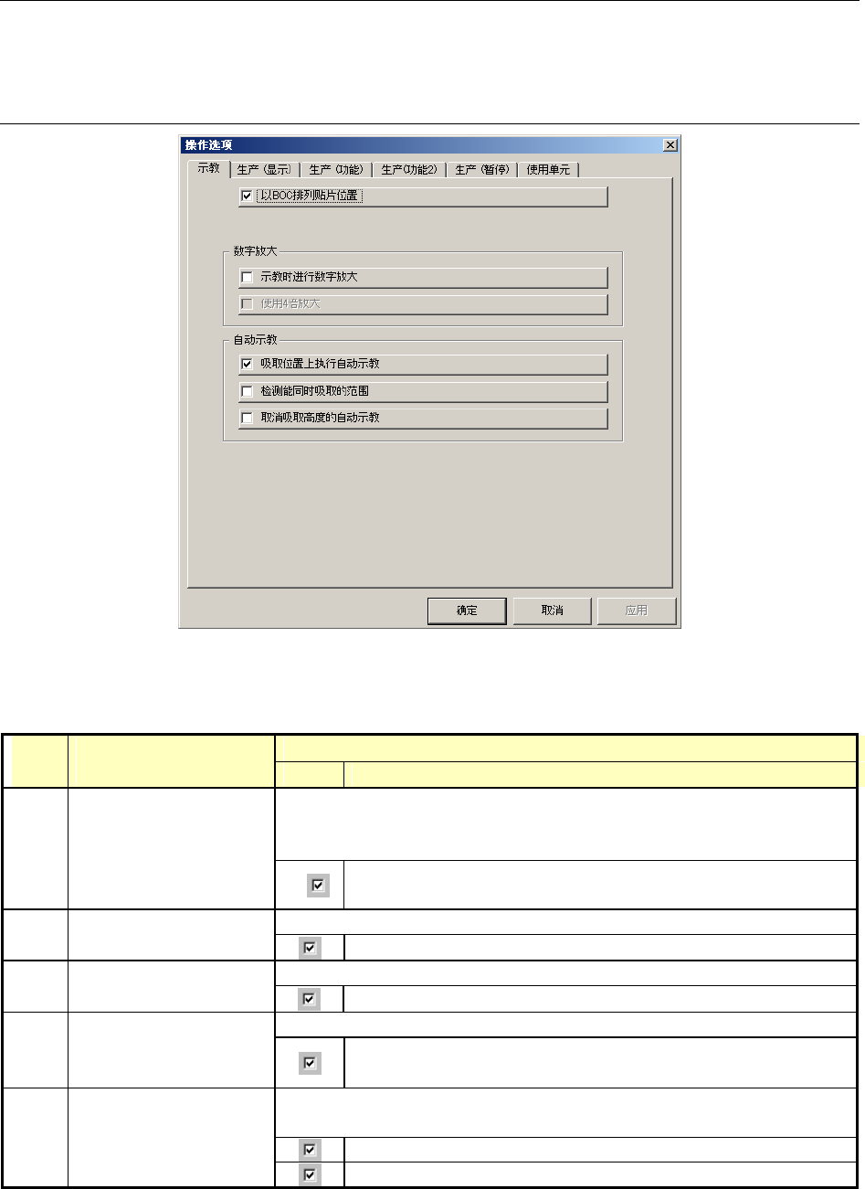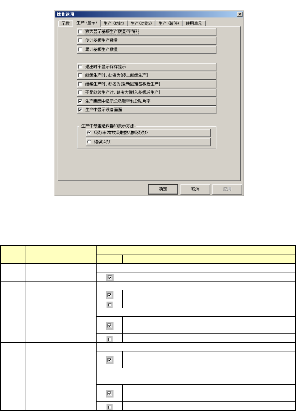 第 4 章 其他功能 4-1-2-2 生产(显示) 设置生产时的画面显示等。 图 4-1-2-2 生产时的显示选项 表 4-1-2-2 生产时显示选项设置项目的细节和内容 序号 . 项目 内容 状态 动作及详细内容 1 放大显示基板生产数 量 设置是否用大写来显示生产运行中的 基板数量。 用大写来显示生产运行中已生产的基 板数量。 2 倒计基板生产数量 设置剩余生产基板数量的显示方法。 显示剩余的预计生产数量。 显示实际生产数量。 3 …