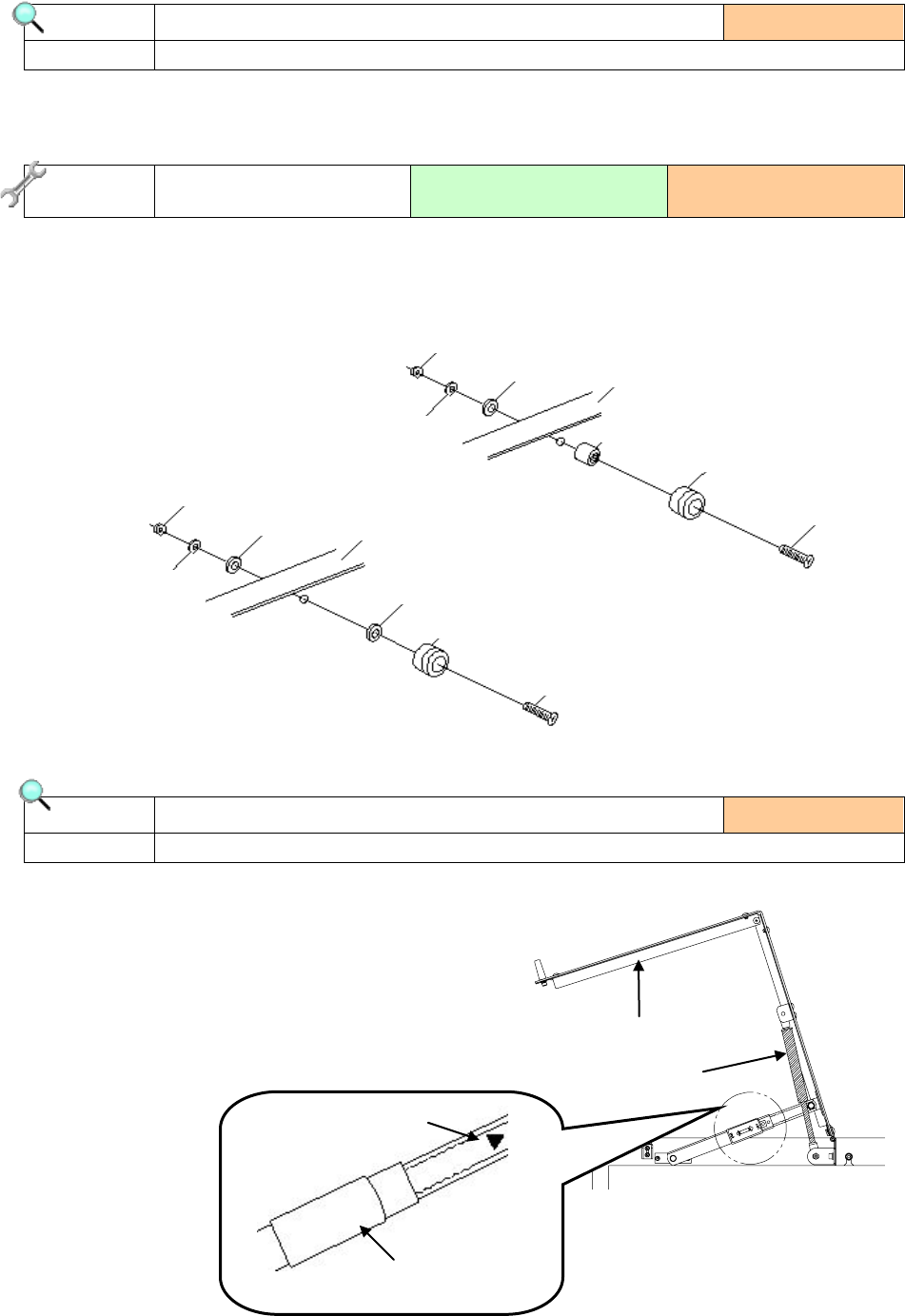 第 5 章 日常检查 1) 用手动控制模式使传送马达动作,检查滑轮旋转是否顺畅。 2) 若旋转不顺畅、或不旋转时,请更换滑轮。 1) 传送滑轮安装在前后轨道板上 。 请松开固定螺丝,更换传送滑 轮。 2) 更换后,请调整传送带的张力。 检查项目 5-2-7 传送滑轮 实施频度 : 每周 检查内容 检查传送滑轮的动作 更换 更换传送滑轮 使用工具: 螺丝刀、扳钳 更换标准 : 旋转不良时 检查项目 5-2-8 气弹簧 实施频度 :每周 检…