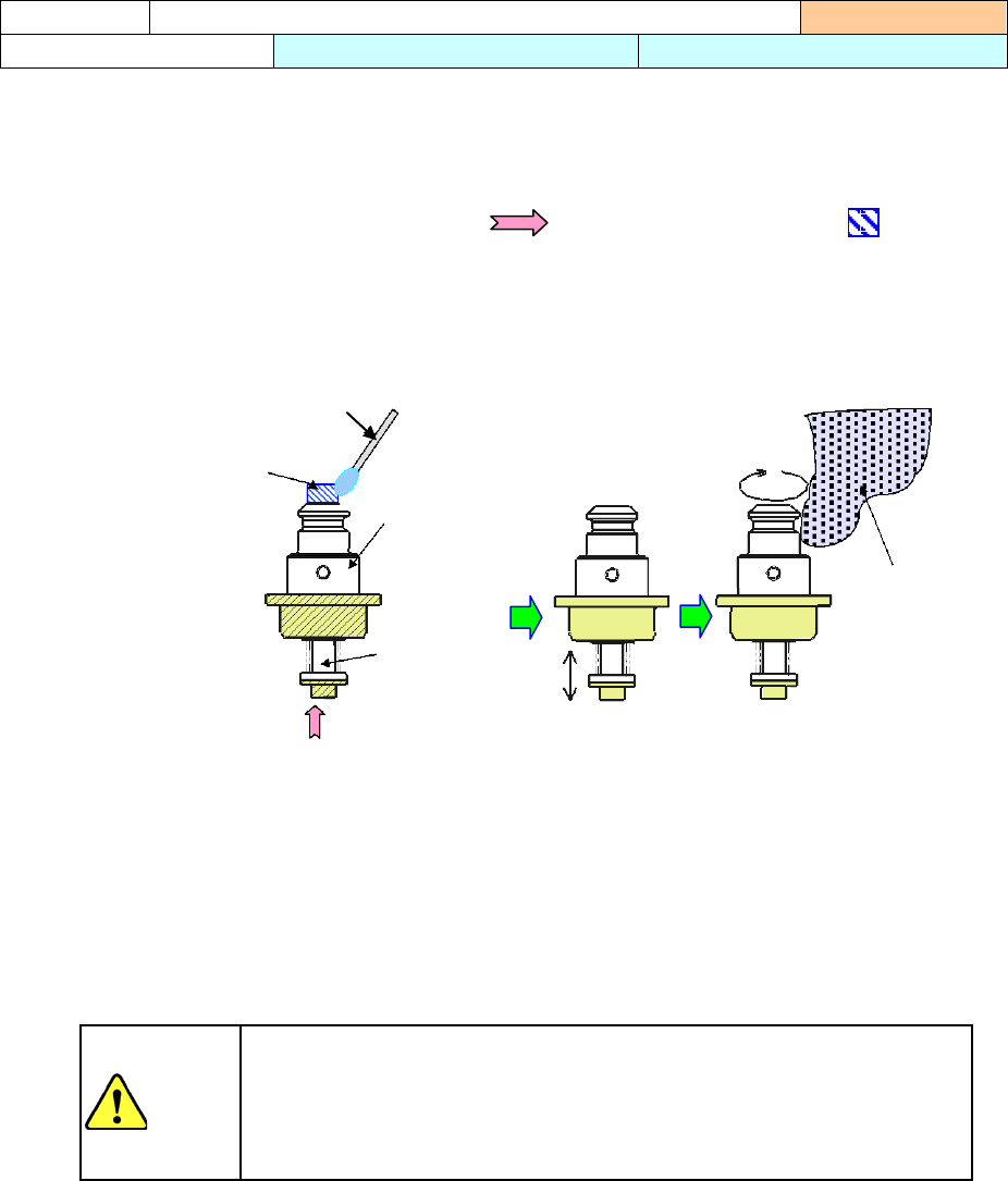 第 5 章 日常检查 1) 500 ~ 504 号吸嘴,可整个浸入酒精液里,在超声波清洗器中清洗约 5 分钟。 2) 使用超声波清洗器清洗 50 5 ~ 508C 号吸嘴时,为防止用酒精清洗造成尖头氨基甲酸乙酯部分剥离, 因此,请用治具等把吸嘴倒置放入,防止尖头浸入酒精。 3) 如若氨基甲酸乙酯部分的脏污和吸嘴扩散器的脏污擦不掉,请用软布浸湿酒精擦干净。 4) 为防止吸嘴内部生锈,洗净后,请按下页「清扫吸嘴后上油」的说明注油。 清扫部位…