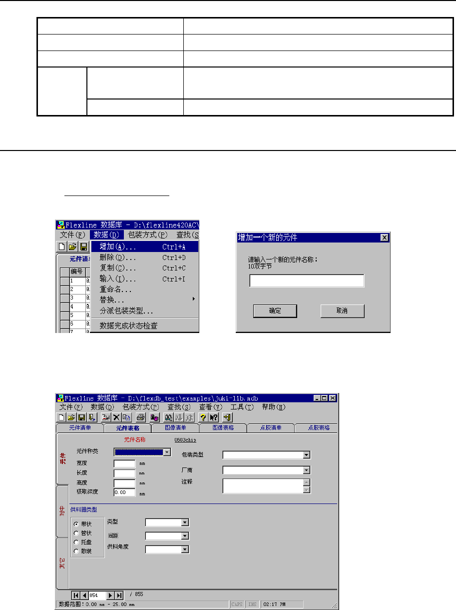 第 6 章 数据库 6-2-2 数据库的画面构成 1) 清单画面 图 6-2-2- 1 元件清单画面 2) 表格画面 元件表格画面由“元件”、“对中”,“其他”这 3 个画面构成。 单击该标签,切换画面。 进行清单与表格的切换,元件数据与图像数据的切换。 图 6-2-2- 2 元件表格画面 行代码 数据标签 总件数(行数) 工具栏 主菜单栏 滚动条 6-8