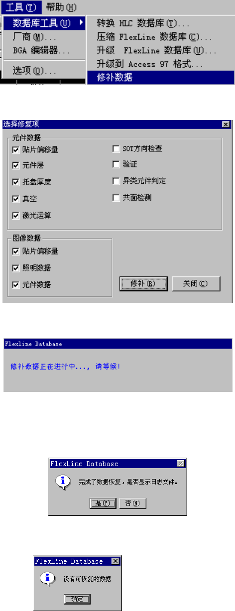 第 6 章 数据库 6-6-1-4 修补数据 将数据注册到 FLEXLINE 数据库时,有时会把超出输入范围的数值注册进去。 使用“修补数据”菜单,可以统一修补不正确的数据。 < 步骤 > 1) 在菜单栏中,选择“工具” / “数据库工具” / “修补数据” 。 图 6.6.1. 4-1 2) 显 示如下画面。选择修补项目 ,单击“修补”按钮,即可开始修 补。 图 6.6.1. 4-2 3 )修补数据时显示如下信息。 图 6…