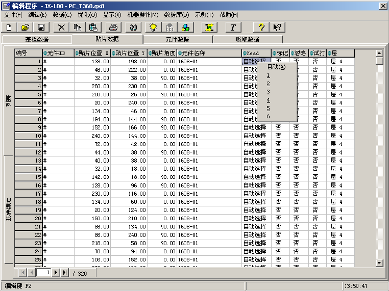 制作基板数据后,单击画面上方的“贴片数据”标签,显示贴片数据制作画面(下图为制作完