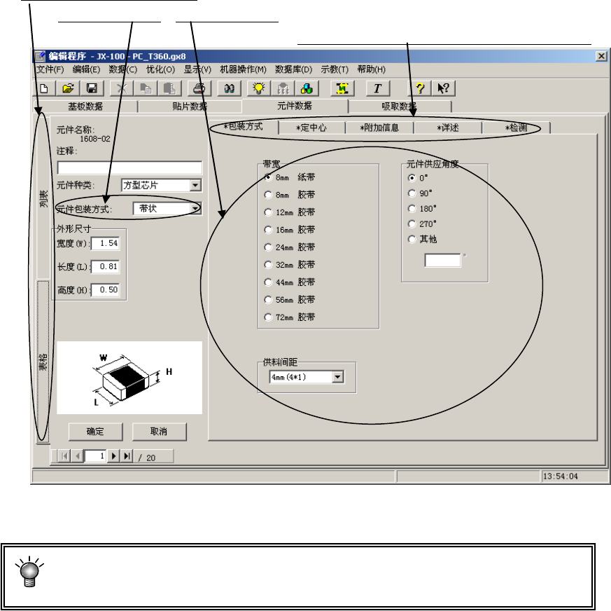 元件数据的制作画面(元件表)包含初始画面在内,共由5个画面(“包装方式”、“定中心”、