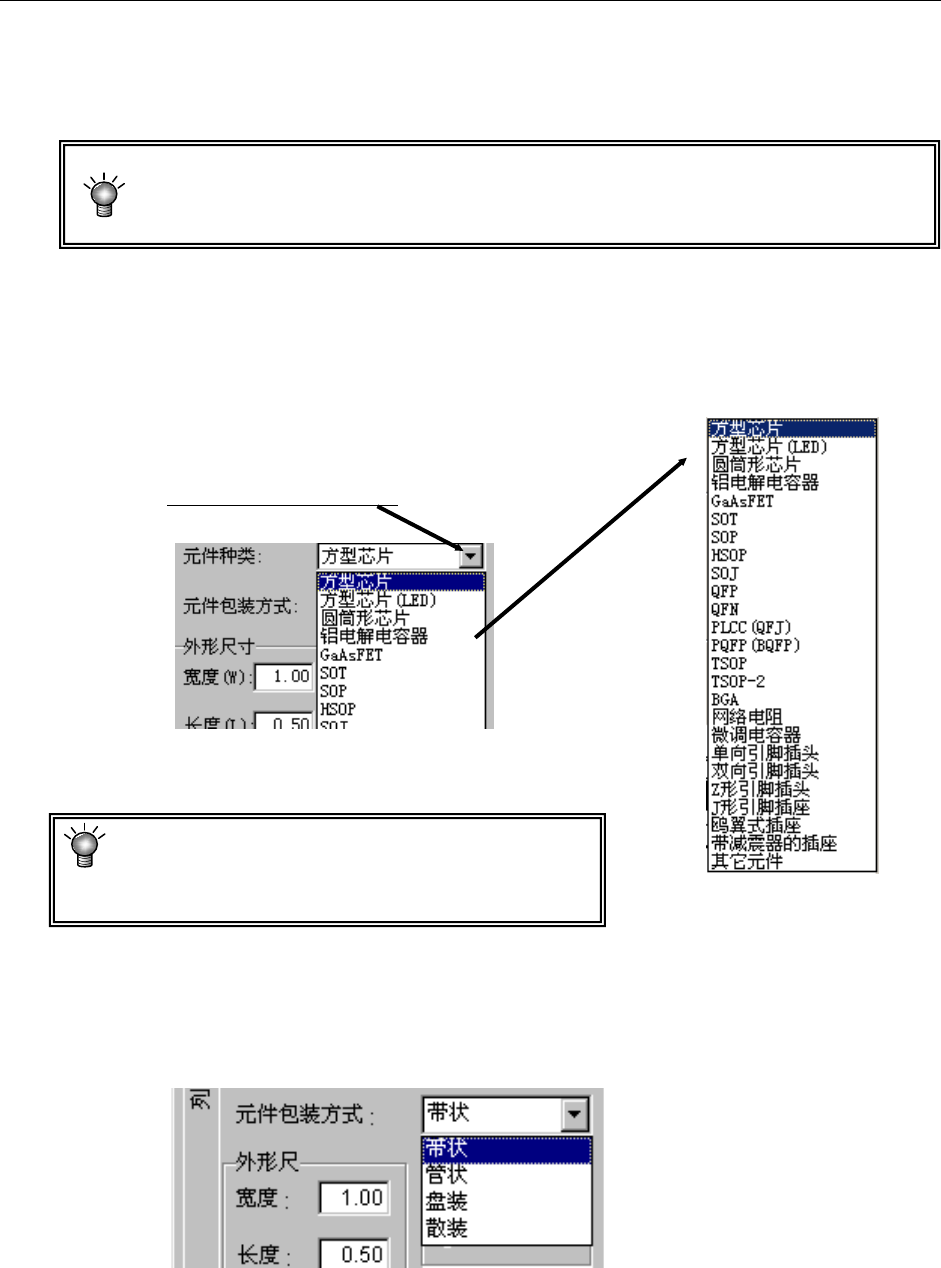 从显示的包装方式一览表中选择元件供给装置的种类。需要进行变更时,请从下拉式一览表