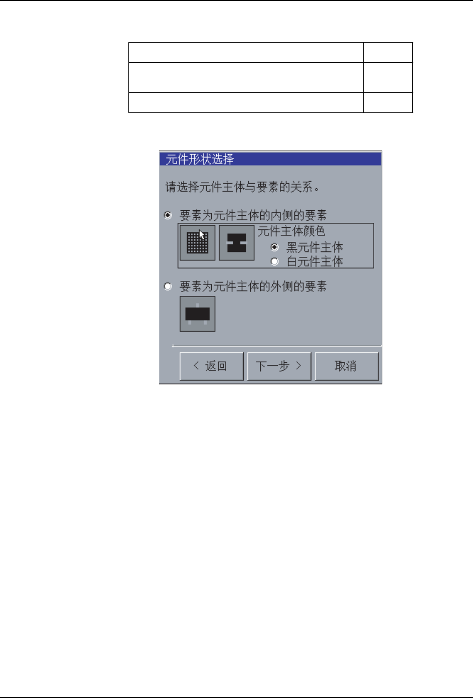 PRG-XPF-1.0S 5. PDW XPF 编程手册 113 17.下面进行的项目, 与设定的 Vision T ype 上不 同。请根据下表进 行设定。 18.选择元件形状,按 下 [ 下 一步 ] 按键。 a. 请对准元件形状从以下中选择。 b. 进入 到 21 . 项。 Vision Type 19 的 时候 18. 项 在 Vision Type 19 的 [ 选择 元件形状 ] 上选择 「要素在主体内侧」 ,并且选择 「白…