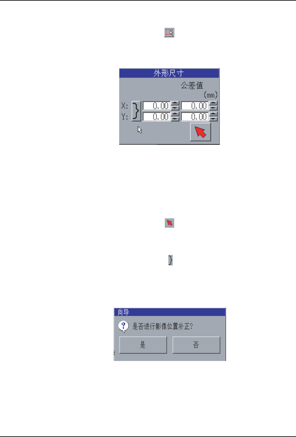 PRG-XPF-1.0S 5. PDW XPF 编程手册 117 操作步骤 1. 按下以下的按键。 2. 在 [ 外形尺寸 ] 对话框和画面上显示出属性。 3. 输入外型尺寸。 输入外型尺寸时,有以下的方法 。 a. 如果知道外形尺寸时 请输入数值到 [X ] 以及 [Y] 中。( 0.00 ~ 150.00 mm) b. 如果由元件影像设定时 请按下以下按键,将元件影像用鼠 标斜向拖动。 4. 按下以下按键,进行影像识别, 从结果补正…