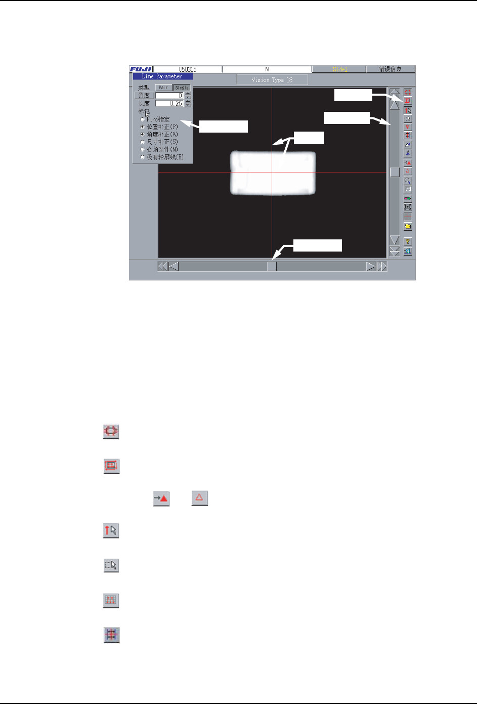 5. PDW PRG-XPF-1.0S 120 XPF 编程手册 5.2.3 用 Vision Type18 编辑 Vision Type18 是用 「 查找线」进行影 像处理的模板。 生产线参数 : 显示·设定查找线。 操作按键 : 由按键执行编辑的各个功能。 中心线 : 是影像的中心。 垂直滚动条 : 在垂直方向移动影像时使用。 水平滚动条 : 在水平方向移动影像时使用。 是定位查找线模式,显示出定位生产 线用的查找线参数。 是检查…