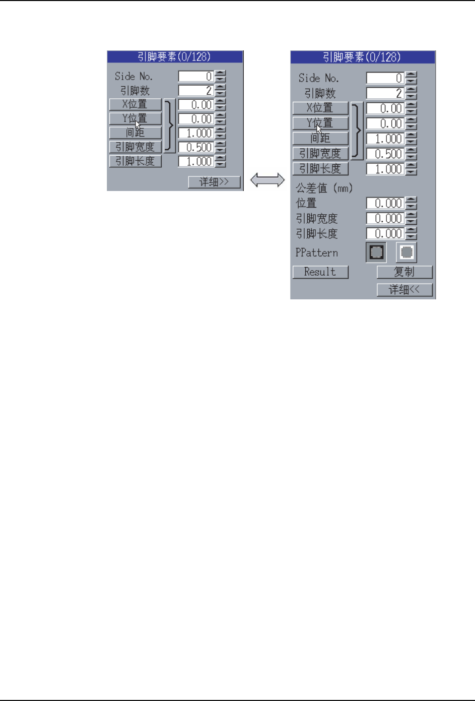 5. PDW PRG-XPF-1.0S 132 XPF 编程手册 再者,在 Vision T ype 1 9的[引 脚 要 素]对 话 框 中 , 设 置[详 细]按 键 。 按下 [ 详细 ] 按键,可以 设定 [ 公差 ] 以及 [PPat tern]。 引脚要素的编辑 操作,请参考 「用 V ision Type 100 编辑」 。 35*6