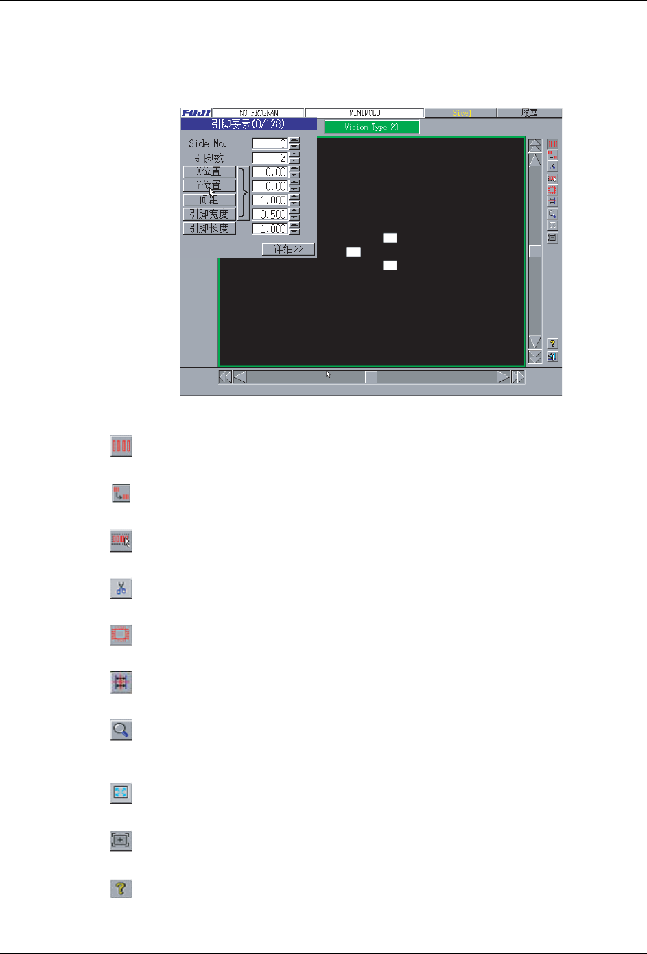 PRG-XPF-1.0S 5. PDW XPF 编程手册 135 说明关于用 Vision Type 20 模板编辑生成要素的操作。 生成要素的方法,如下所示。 · 用全自动输入模式输入要素 自动识别引脚的方向生成要素。 · 用自动输入模式输入要素 指定引脚的方向生成要素。 ·复制要素 复制选择的要素。 · 手动输入要素 使用要素摇柄手动生成要素。 设定要素,结束模板编辑的时候 ,请参考下面的项目。 · 结束模板编辑 用全自动输入模式输…