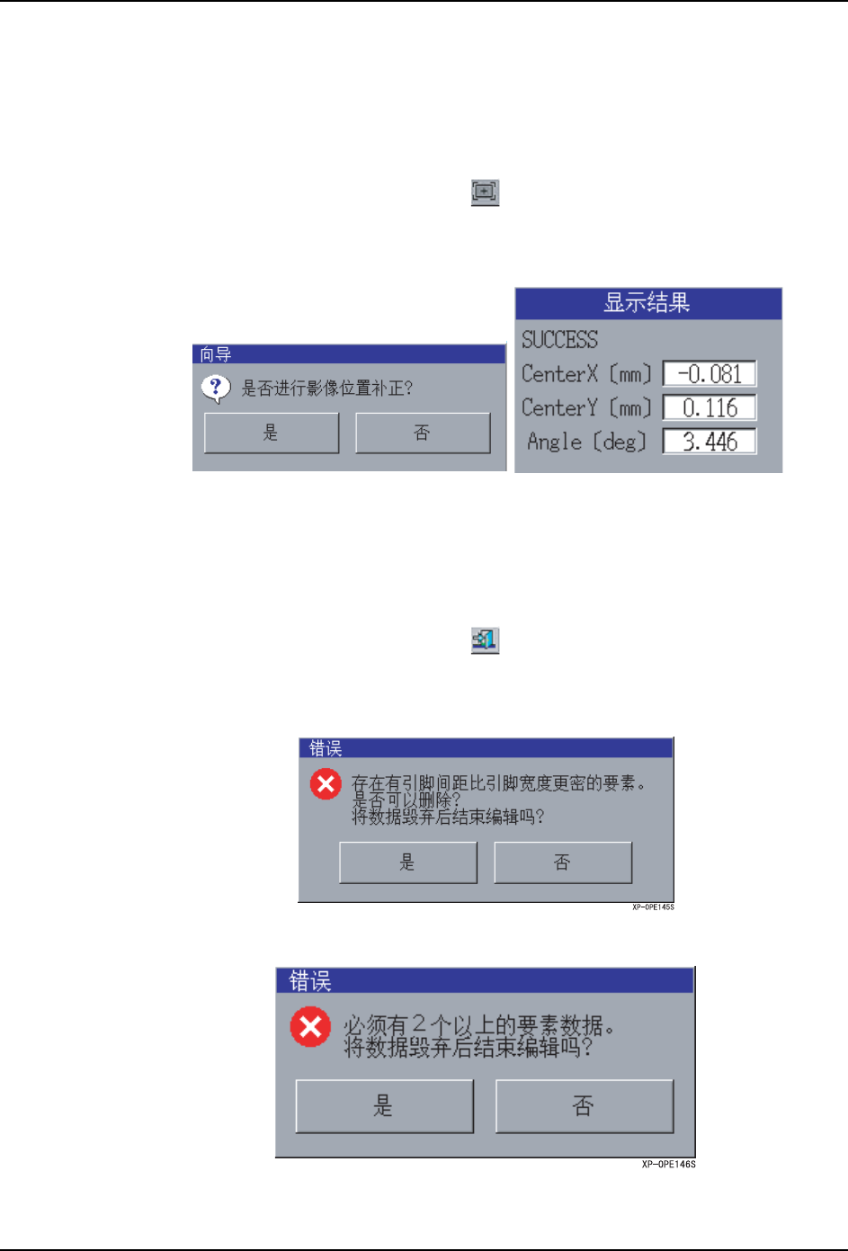 PRG-XPF-1.0S 5. PDW XPF 编程手册 153 结束模板编辑 要素的设定结束,要结束模板编 辑,进行下面的操作。 操作步骤 1. 按下以下按键,进行影像位置补 正。 2. 使用生成的要素进行影像处理。在影像处理后,显示出是否进行影像位置补正询问的信 息。 3. 按下以下按键。 a. 进行数据检查。 数据检查的结果, 有引脚宽度比间距大的要素时, 不能保存编辑的要 素数据。此时出现以下的警告信息 。 b. 要素数据没有 …