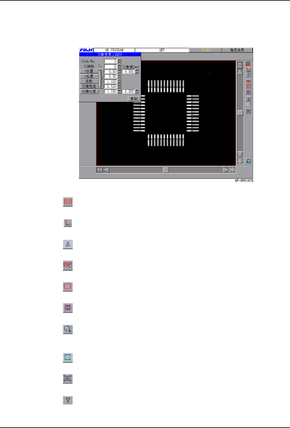 PRG-XPF-1.0S 5. PDW XPF 编程手册 157 5.2.7 用 Vision Type124 编辑 Vision Type124 可以 进行 J 引脚元件的要 素的设定、生成。 必须有 2 个以上的要素的元件。 是引脚要素输入模式。 复制选择的引脚要素数据。 全部删除选择的要素数据。 是引脚要素自动输入模式。 是引脚要素全自动输入模式。 再次用向导进行卡尺测定。 将指定的中心点作为基准扩大 / 缩小显示的影像。 左击时…