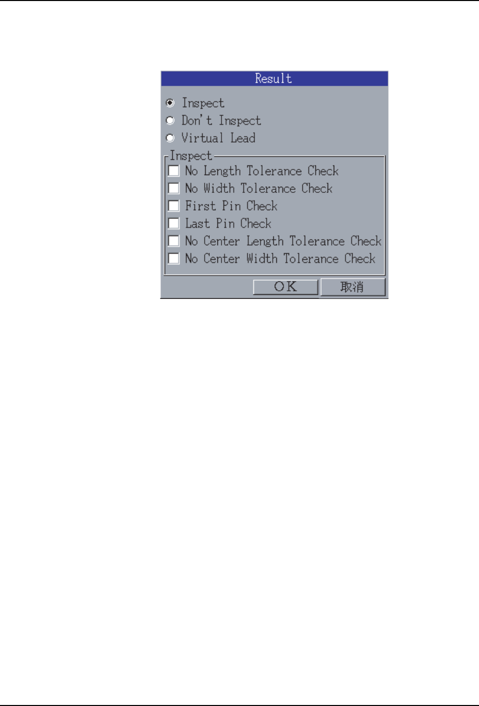 PRG-XPF-1.0S 5. PDW XPF 编程手册 163 5. 设定引脚影像处理时候的检查内 容 (Result )。 在 [ 引脚要素 ] 对话框上按下 [Result] 按键后打开 [Result] 对话框,显示出引脚影像 处理时的检查内容。显示出当前 的引脚的影像处理时候的检查内容。 a. 在 「I nspect」项的各项目, 只有选择 [Inspect] 的时 候有效。( 选择 [Ins pect] 以 外时无效 ) I…