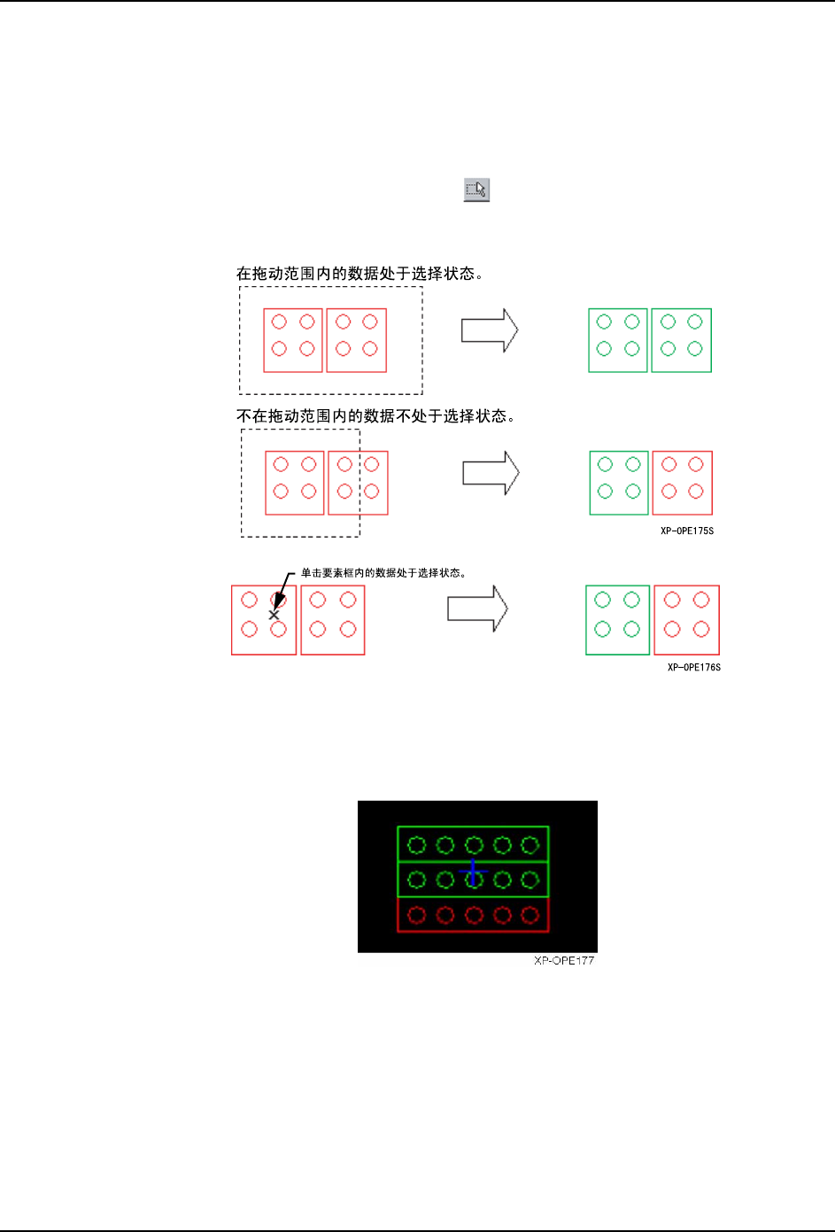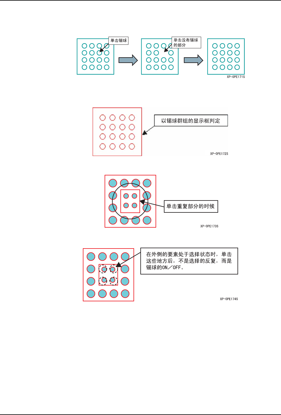 5. PDW PRG-XPF-1.0S 188 XPF 编程手册 现有要素的一次性编辑 在此模式上,手柄不显示在选择 的要素上。编辑在 [ 锡球要素 ] 对话框上进行。 操作步骤 1. 按下以下按键。 2. 将编辑的要素用鼠标的拖动框住 或者单击进行选择。 3. 使用 [ 锡球要素 ] 对话框编辑要素。 这个时候,按下 [ 锡球合成 ] 按键,选择的要素合成 1 个要素。 备注 )在此模式上不显示移动用的手柄。请在选择状态下拖动或者在 …