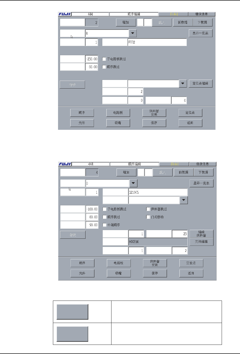6. 编辑程序 PRG-XPF-1.0S 206 XPF 编程手册 在选择顺序的显示画面上编辑 在 [ 顺序编辑 ] 画面上按下 [ 选择显示 ] 按键后, 选择的顺序可 以以一个画面显示。 在 [ 顺 序编辑 ] 画面上,[ 顺序编辑 ] 画面项目旁无需滚动就可以编辑。 显示画面根据顺序的种类有如下 3 种。 [ 基准定位点顺序的显示 ] 画面 [ 子电路板跳过顺序的显示 ] 画面 35* 6