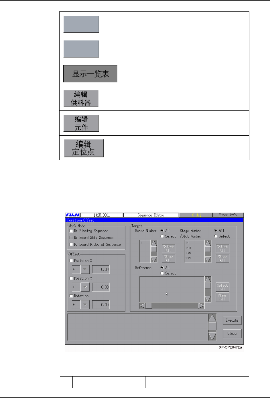 6. 编辑程序 PRG-XPF-1.0S 208 XPF 编程手册 在顺序的坐标添加修正值 以子电路板为单位对其子电路板 上的指定种类的坐标进行修正的功 能。 1. 操作步骤 a. 选择 [ 顺序编辑 ] 画面的 [ 坐标修正值 ] 按键。显示以下的画面。 b. 选择顺序的种类。 选择添加的修正值的坐标。 显示前面一个顺序数据。 显示后面一个顺序数据。 回到顺序数编辑画面 ( 一览表型 )。 显示供料器安装画面。 显示编辑元件画面。 显…
