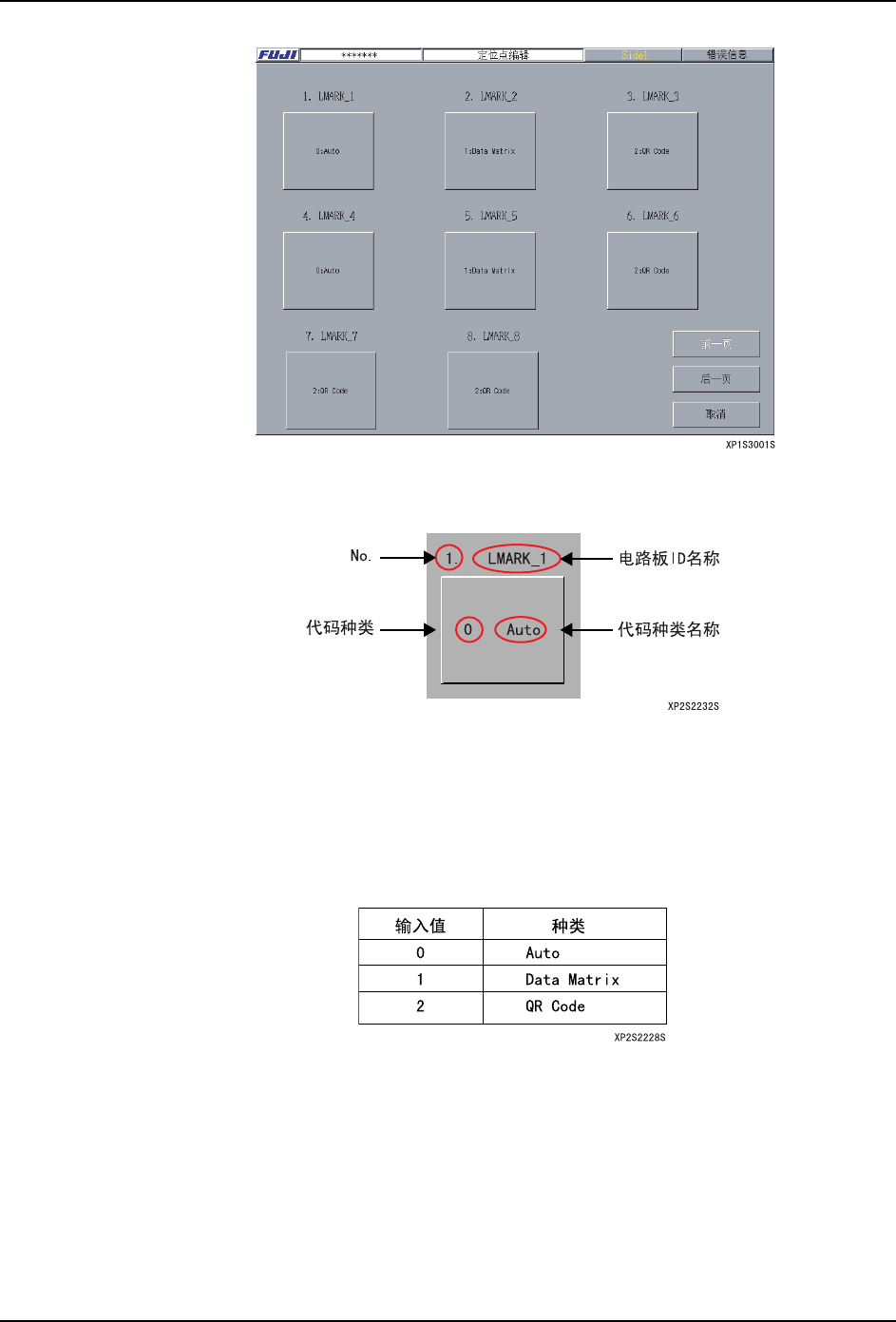 6. 编辑程序 PRG-XPF-1.0S 226 XPF 编程手册 3. 创建或 者编辑电路板 ID(2D Code) 电路板 ID(2D 编码 ) 的创 建或者编辑在这 个画面进行。 ( 当前不支 持这个画面的功能 ) 请 在 这个画面使用以下的按键及文本 框进行创建或者编辑。 a . [定 位 点 名]文 本 框(最 大3 0个 字 符) 输入定位点名。 注意 )有定位点名不能使用的字符。详细请参考 " 2.4 输入限制 …