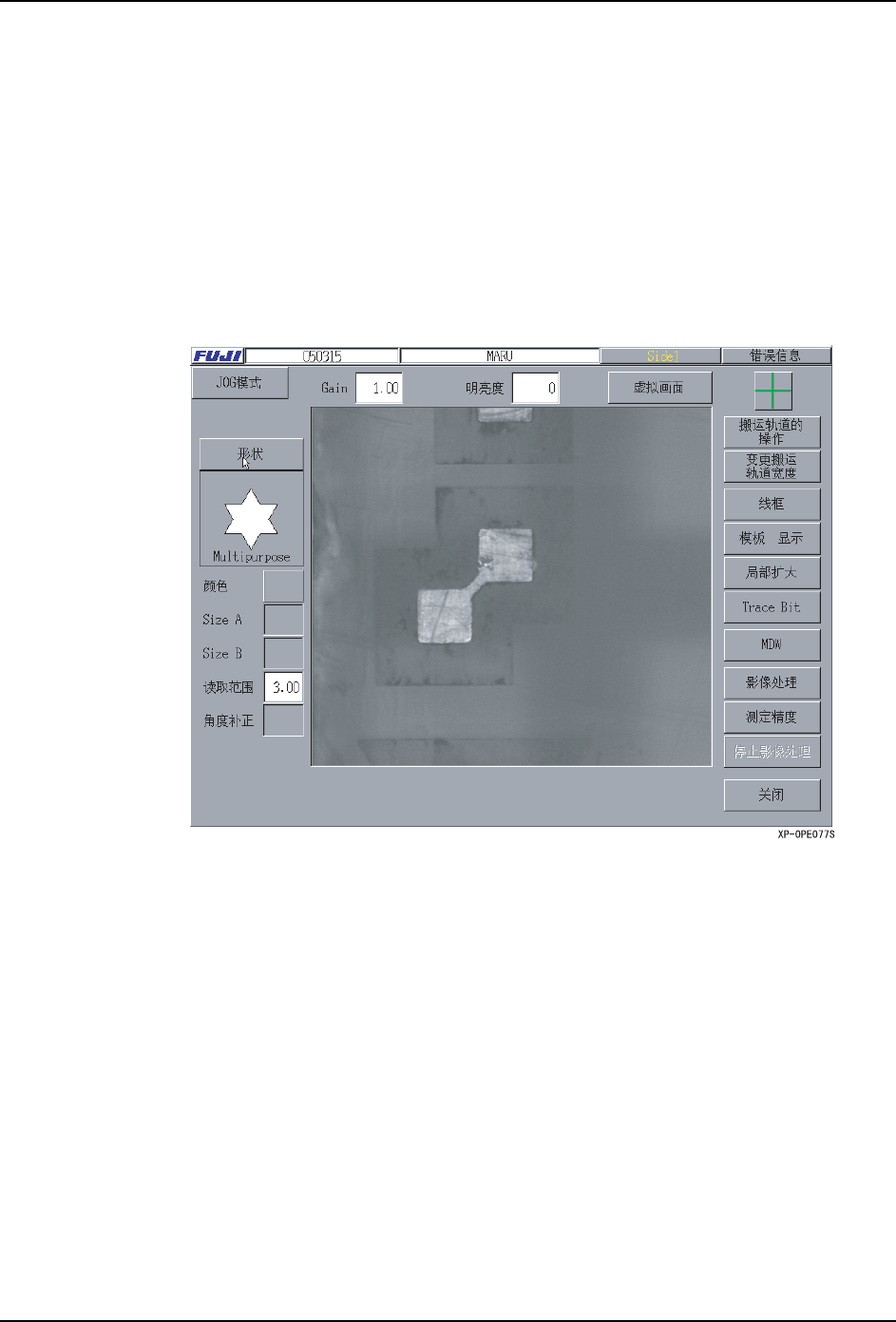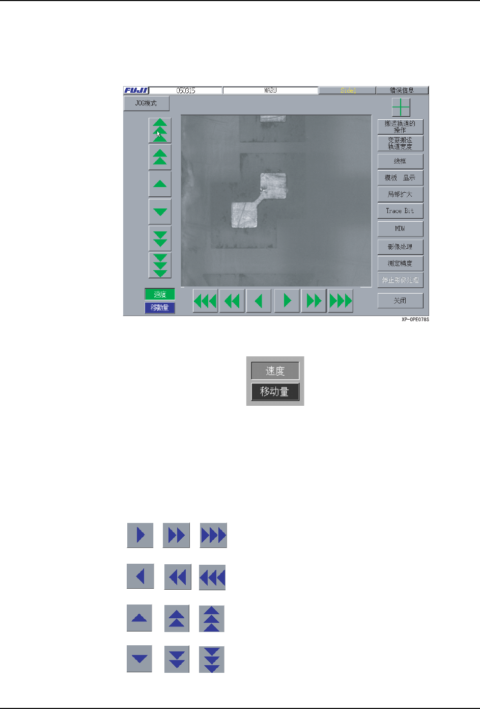 PRG-XPF-1.0S 6. 编辑程序 XPF 编程手册 229 a. [JOG 模 式 ] 按 键 切换到 JOG 模式。 JOG 模式是移动相机到 X 轴方向、Y 轴方向的模式。进入 JOG 模式的话,在图形编辑 器上变成如下画面。 · 在画面左下显示出 [ 速度 ] 按键和 [ 移动量 ] 按键,选择移动模式。 · 各箭头键的移动轴的方向和各自 的速度及移动量,如下所示。 按下 [ 速度 ] 按键 : 按下 [ 速度 ] 按键,…