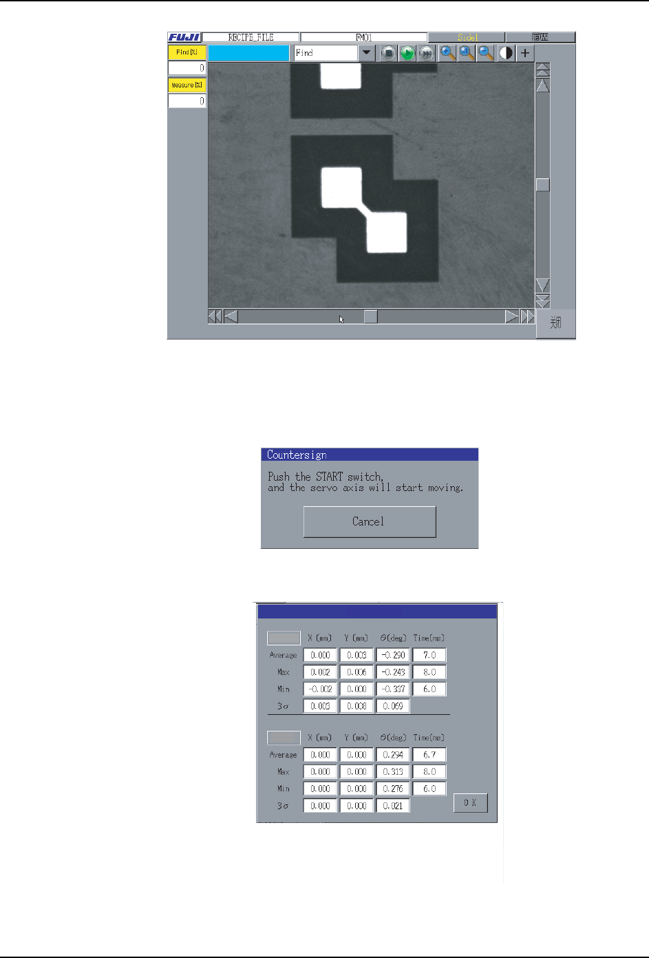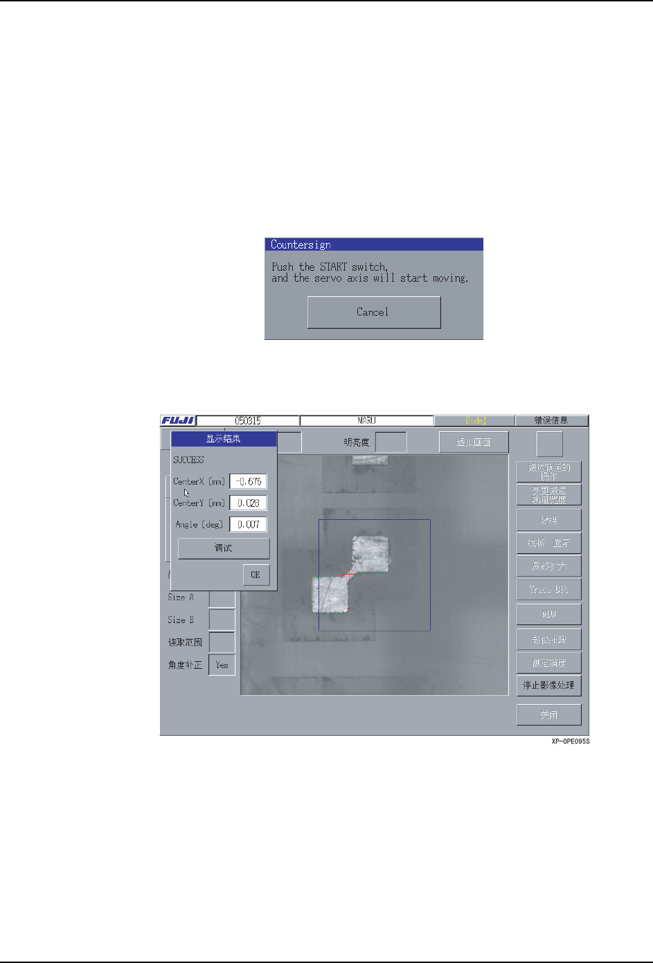 6. 编辑程序 PRG-XPF-1.0S 232 XPF 编程手册 注意 )该设定到重新启动机器时有效。 q. [MDW] 按 键 使用向导创建基 准定位点的模板 。(MDW 的 详细内容,请参 考 " 4. M DW ") r. [ 影像 处理 ] 按键 使用创建的模板,进行是否能识别 相机影像的定位点试验。 按下这个按键,显示如下对话框。 请确认定位点是否显示在画面上, 按下启动按键。 · 影像处理成功的话,显示…