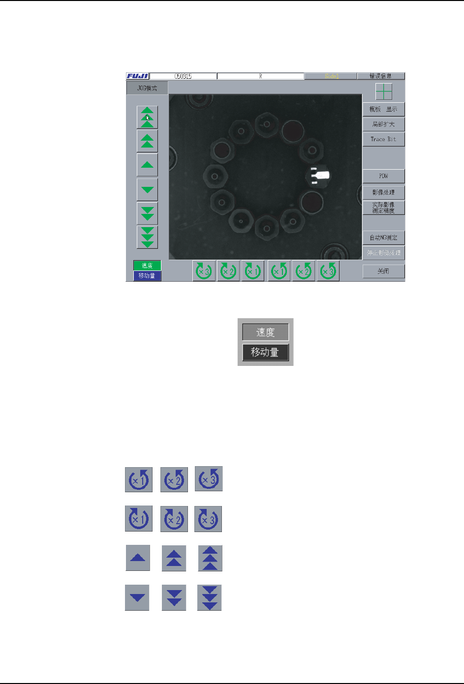 PRG-XPF-1.0S 6. 编辑程序 XPF 编程手册 267 b. 按下 [ 机器操作 ] 按键,显示如下菜单。 备注 )[Side1 Unit 夹紧 ] 以及 [Side2 Unit 夹紧 ], 只有在可以脱卸元件更换单元时显示。 这个图形编辑器,能进行下面的 操作。 · 用 JOG 模式进行微动操作 ·部分扩大 ·设定 TraceLevel · 进行元件的引脚浮起检查 · 使用创建的模板进行影像处理试 验 · 进行实际影像精度…