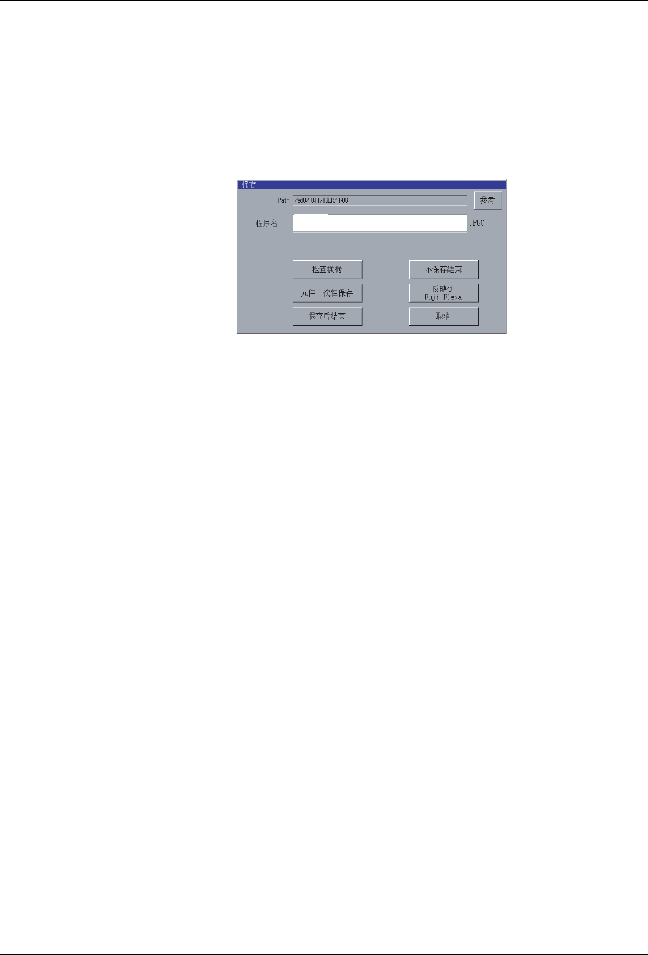 PRG-XPF-1.0S 2. 生产程序概要 XPF 编程手册 25 从 Fuji Flexa 读 取生产程序 操作步骤 1. 从主 画面选择 [ 程序 ]、[ 编辑程序 ],显示出 [ 编辑程序 ] 画面。 2 . 按 下[选 择 程 序]画 面 左 上 角 的[▼] , 选 择[ Fuji Flexa] 驱动器。 3. 选择[Fuji Flexa]后, 在 「程序名」 的区域中显示出保存在Fuji Fle xa中的Job的一览表。 …
