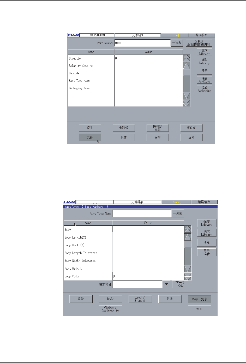 1. 从 [主画面]顺序选择 [ 生产程序 ]、[ 编辑器 ]、[ 元件 ],显示 [ 元件编辑 ] 画面。