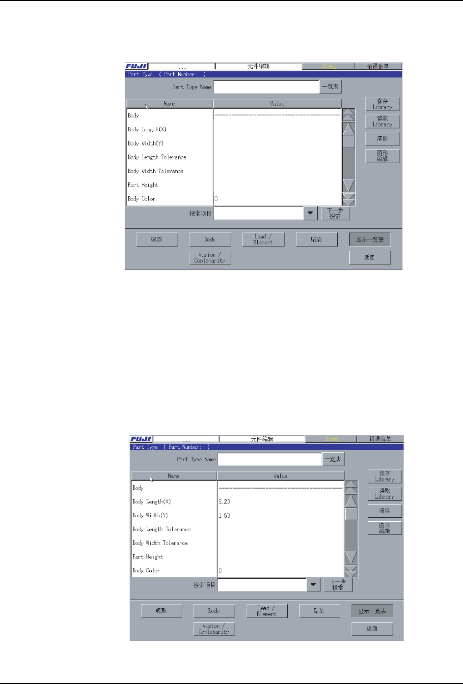 PRG-XPF-1.0S 3. 创建生产程序例子 XPF 编程手册 43 5. 请在 Part Type Name 中输入下面的数值。 ·Part Type Name:3216RH06 6. 输入 元件的主体尺寸。 请在下面的项目里输入各自电阻 器的主体尺寸。 备注 )在 Body Length Tolerance、Body Width 中,请输入 + 方向的误差到 Tolerance。 Body Length(X): 3.2 ( 元件…