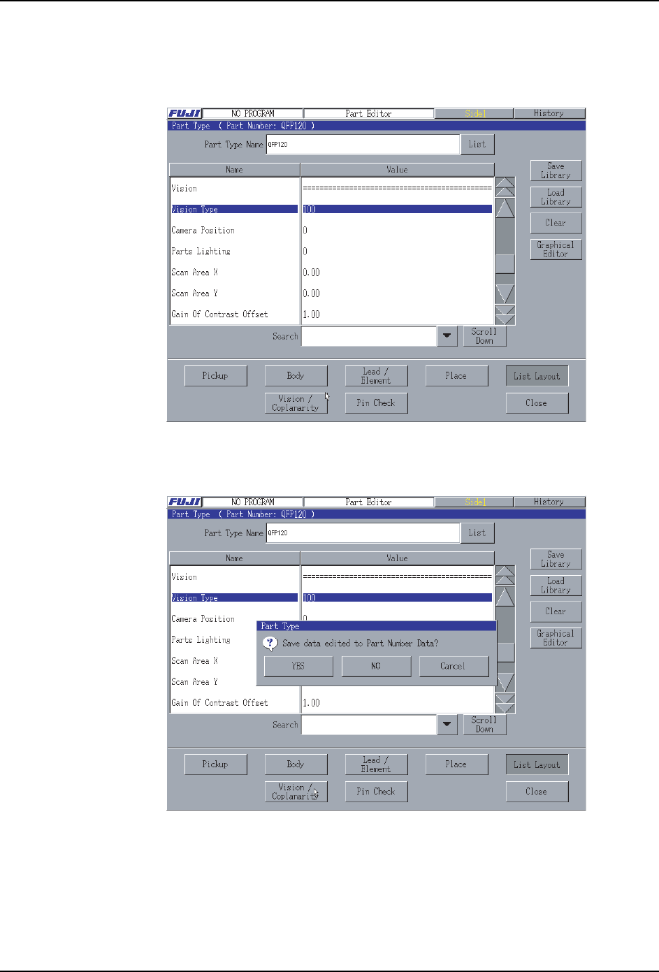 3. 创建生产程序例子 PRG-XPF-1.0S 58 XPF 编程手册 16.指定 Vision Type。 QFP 的场合,请指定 「100」 。 ·Vision Type:100 17.请按下 [ 关闭 ] 按键。 显 示 出 如 下 对 话 框 , 请 按 下[是]按 键 。 编 辑 的 内 容 反 映 到P a r t Number 数据中 。 08PRG - 00 4 9 E 08PRG - 0050 E