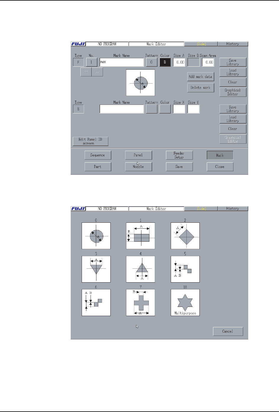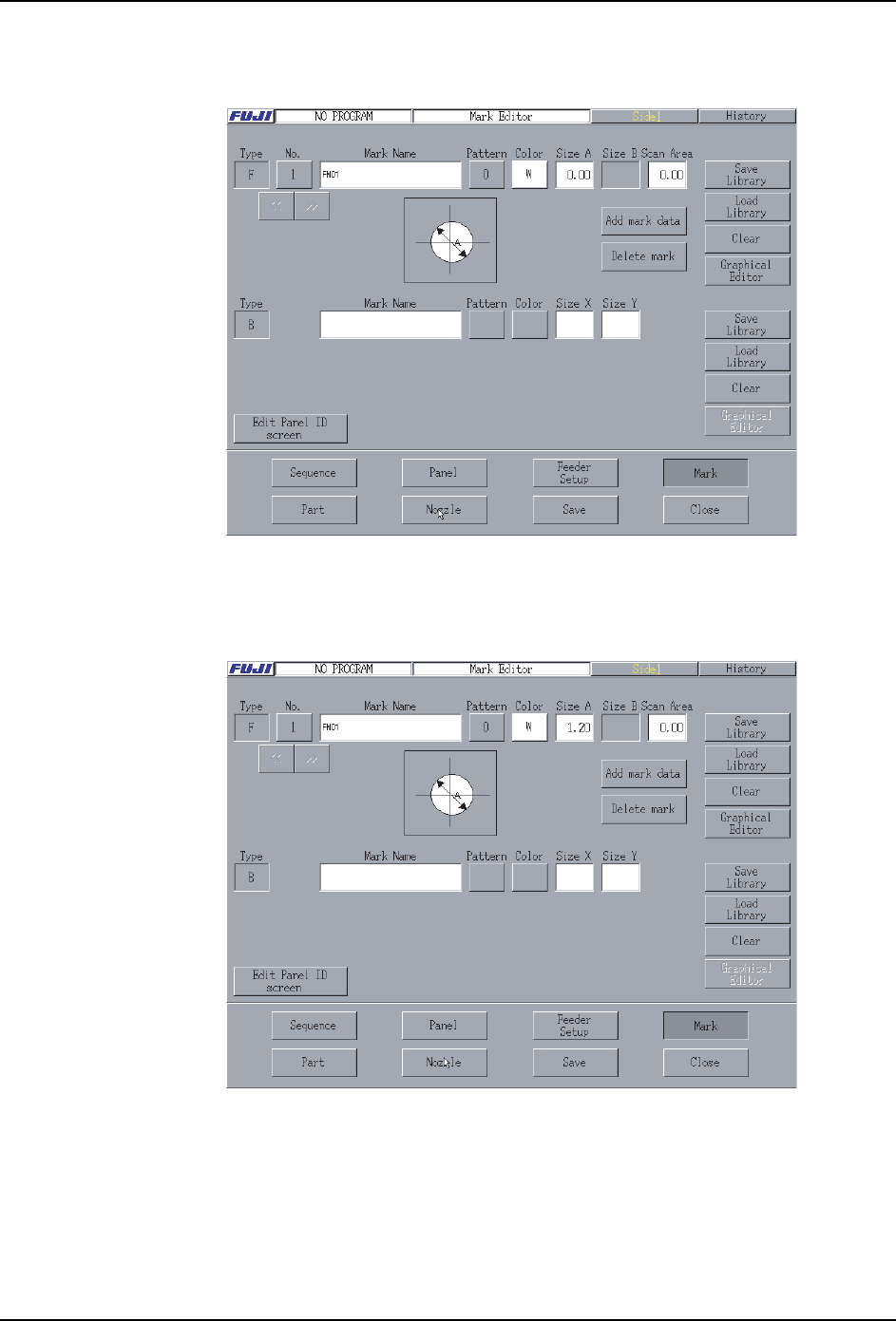 PRG-XPF-1.0S 3. 创建生产程序例子 XPF 编程手册 65 2. 请输 入下面的数值到定位点名。 定位点名 :FM01 如下显示。 3. 选择 定位点的形状。 请按下画面的形状下有的按键。 因为显示出下面的画面, 请选择 「圆」 定位点 ( 「0」 )。 08PRG - 0062 E 08PRG - 0063 E