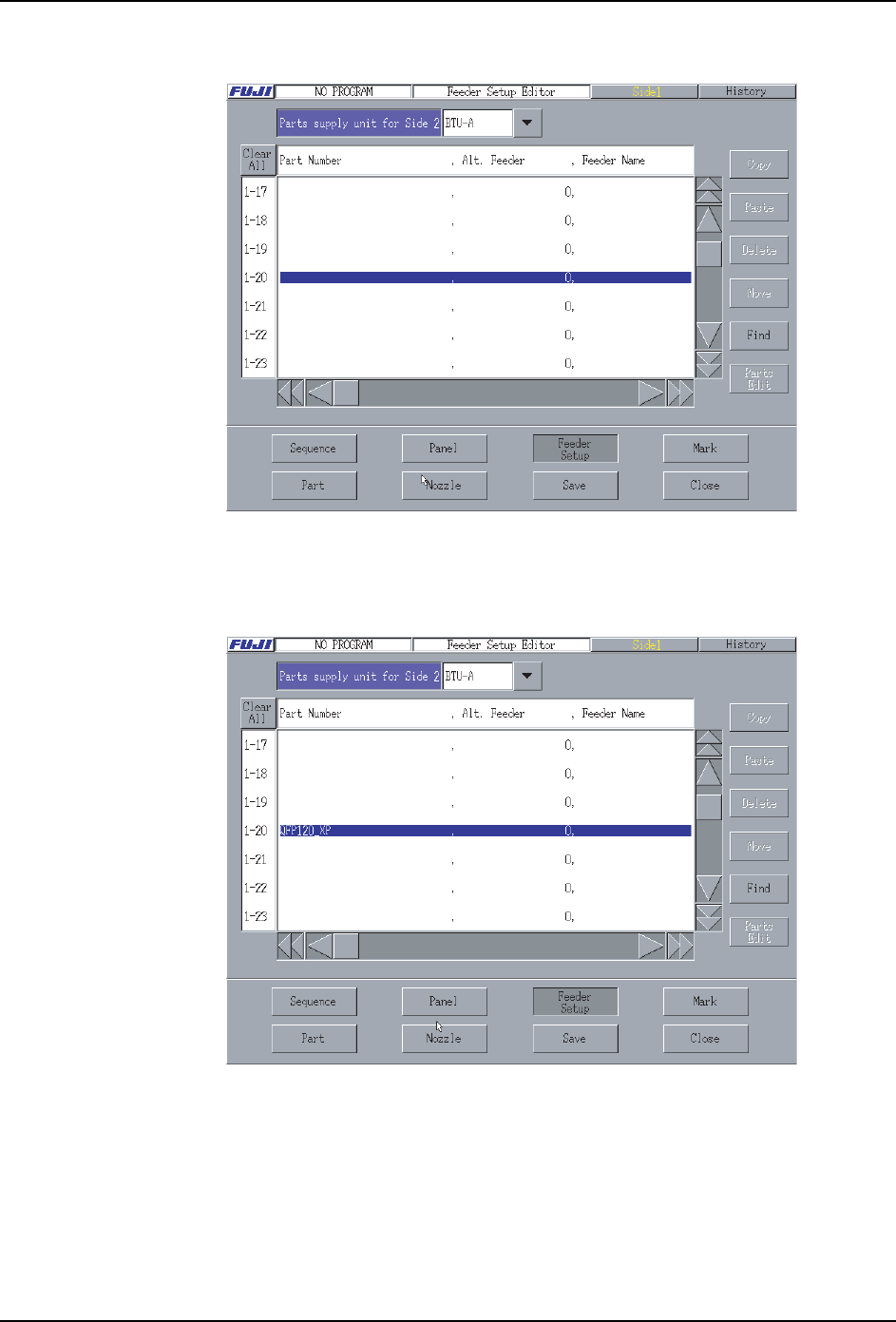 PRG-XPF-1.0S 3. 创建生产程序例子 XPF 编程手册 69 2. 选择 Side2 元件供应单元。请选择下面的数值 。 Side2 元件供应单 元 :BT U-A 变更元件供应单元使时,显示出 如下信息,请按下 [OK] 按键。 3. 在料 站 「1-20」中设定 元件号码 「3301」的元件。 从平台 / 料站号码 ( 画面左端的号码 ) 选择 「 1-20」 ,请按下 「元件号码」列。显示出 如下元件号码的一览表。 0…