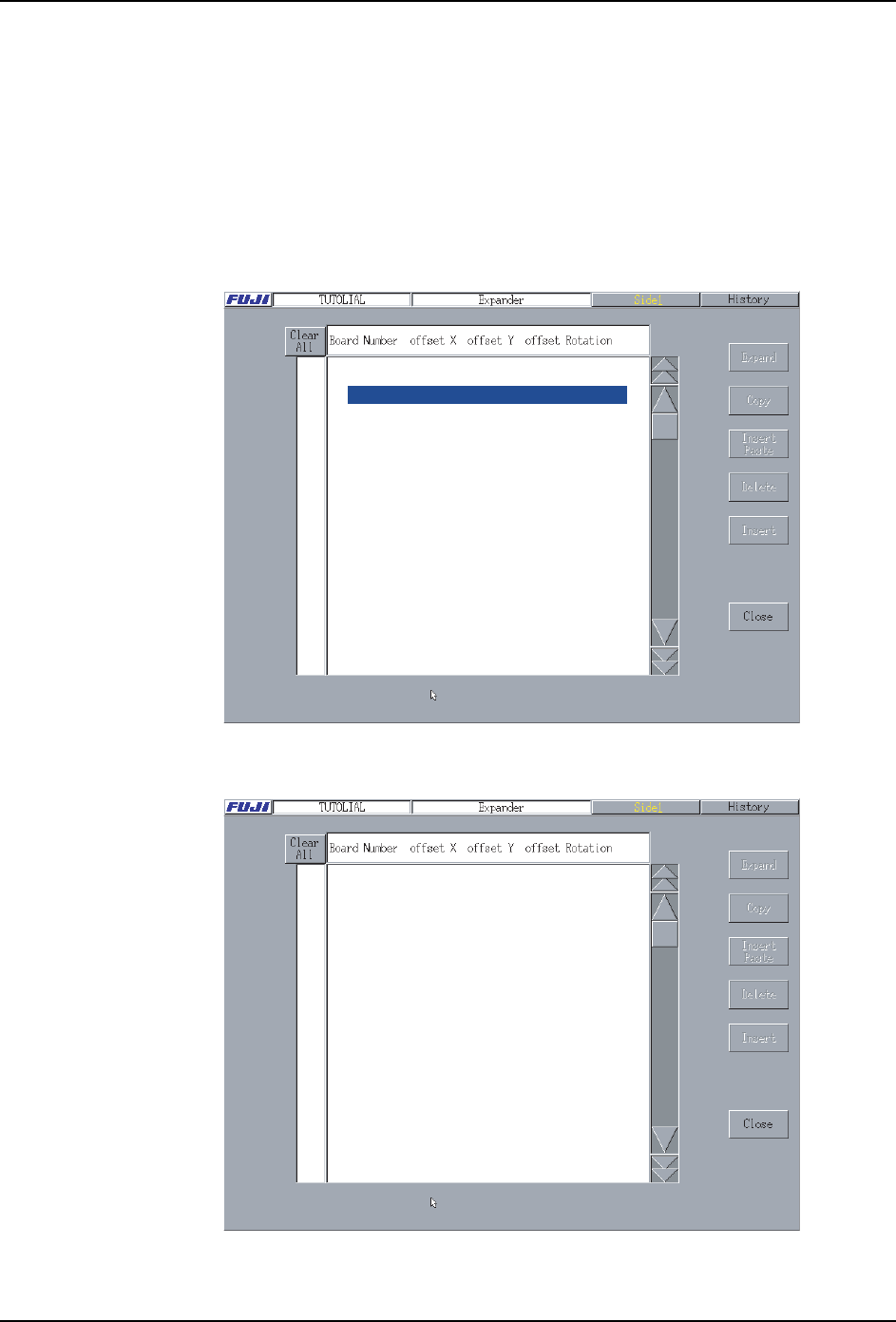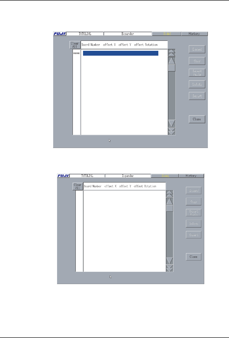 3. 创建生产程序例子 PRG-XPF-1.0S 82 XPF 编程手册 3.7.1 操作步骤 1. 从 [主 画面]中顺序选择 [ 生产 程序 ]、[ 扩展器 ], 显示 [ek usupanda] 画面。 2. 按下 「 子电路板 No.」列的 「* ***」 ,输入 「1」 。 显示如下。 08PRG - 0089 E **** , ****.** , ***.** , ***.** 08PRG - 0090 E **** , *…