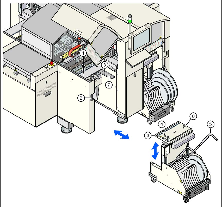 → 小心地将料车完全推入贴片机,直至挡杆处。