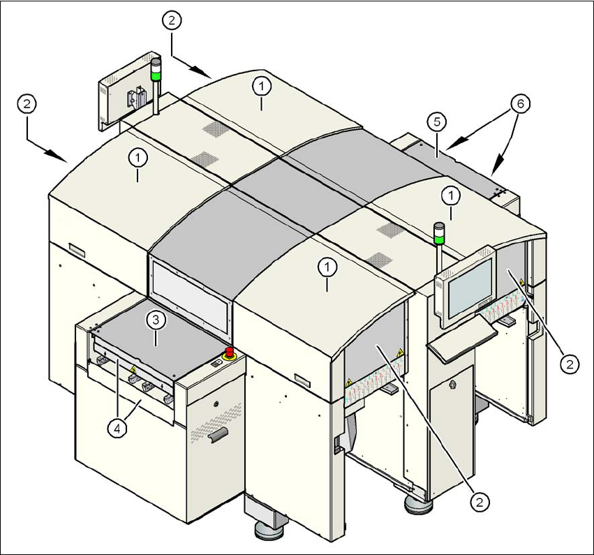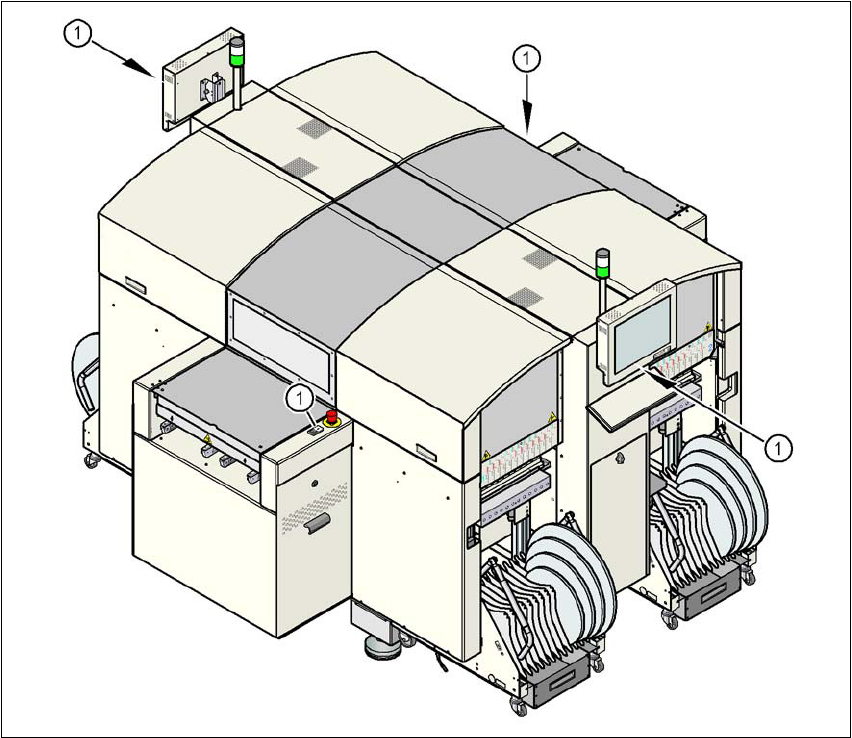 如果保护罩之一向上旋转,或者 PCB 传送导轨上的盖板之一升起,悬臂轴的主电源将立即断开。