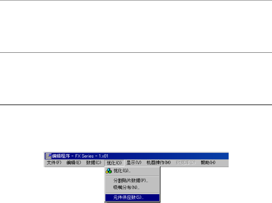操作手册 II Rev00 2-88 (2) 显示如下元件供应数画面。 优化后的供料器数、或手动设置的供料器数的显示区域 元件数据的元件名 设置优化供料器数时,显示为“自动” (初始值) 图 2-4-1-1-2 元件供应数画面显示例 供应数的初始值为“自动” 。 在“自动”时, 供料器的个数基本为一个 。但当特定元件 的点数比其他的多出很 多 (为整体平均的 3 倍以上) 时,将自动增 加元件的供应数。因此 ,在供料器只 有 1 个,或…
