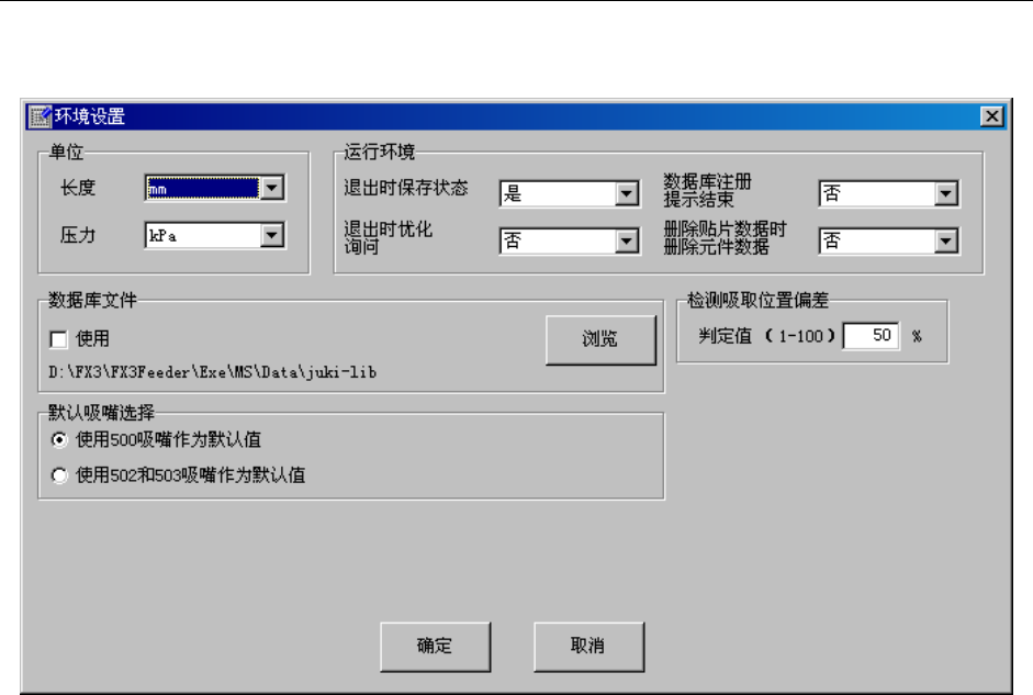 操作手册 II Rev00 2-151 2-5-3 环境设置 设置程序编辑的环境。 从菜单栏中选择“文件”/“环境设置”,显示设置画面。 图 2-5-3-1 环境设置 (1) 单位 选择编辑时的长度、压力的显示单位。 ●长度…从mm、1/100mm、inch中选择。 ●压力…从kPa、Level(大气压)中选择。 (2) 运行环境 1) 退出时保存状态 选择是否保存退出编辑程序时的状态,在下次启动时重新显示。 ●是:在下一次启动编辑程序…