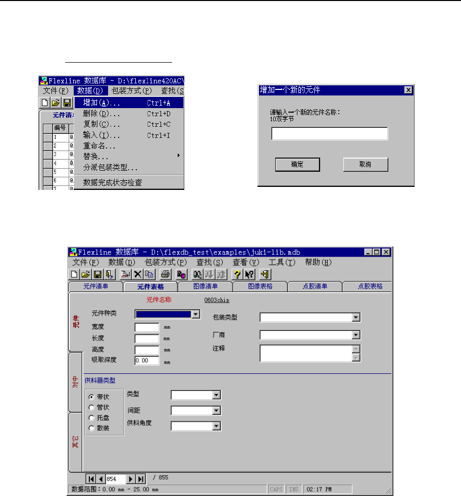 操作手册Ⅱ Rev00 4-11 4-1-3-1 增加 新建元件数据。 <步骤> ① 请单击“数据”-“增加” 。 ② 显示新建元件名输入画面。 输入元件名,单击“确定” 。 图 4-1-3-1-1 a,b 菜单栏、新建元件名输入画面 ③ 显示元件表格画面。请制作数据。 图 4-1-3-1-2 [元件表格]-[元件]