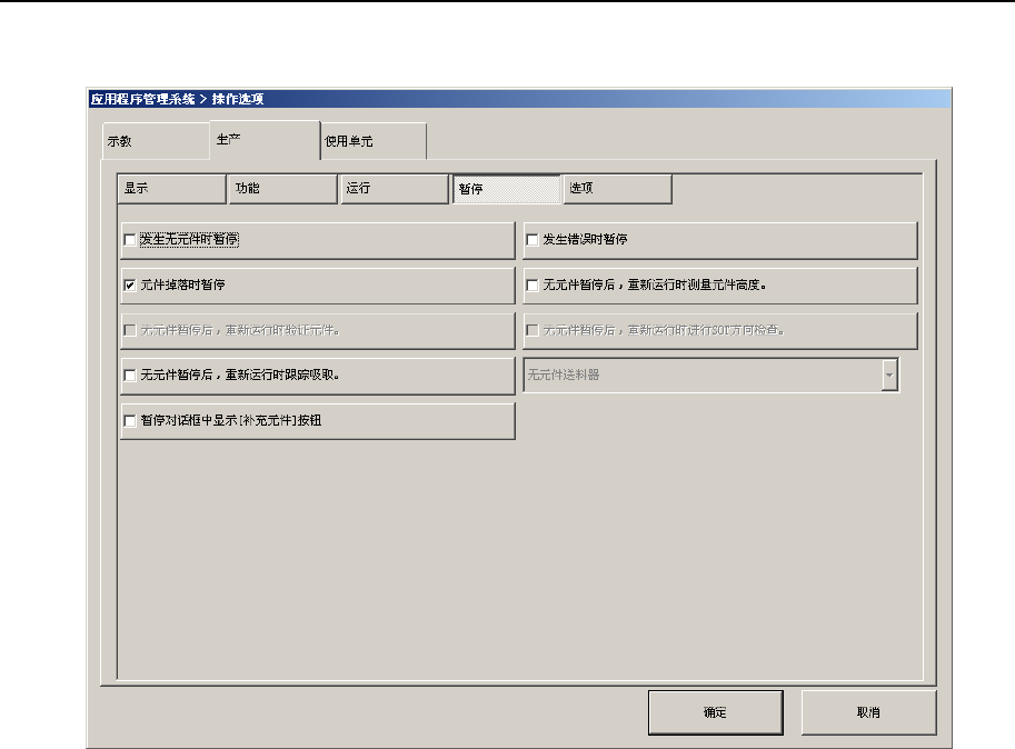 操作手册Ⅱ Rev00 4-43 表 4-2-3-4-1 生产中暂停选项设置项目的细节和内容 内容 序号 项目 状态 动作及详细内容 设置发生元件用完时的动作模式。 元件用完时暂停生产。 1 发生无元件时暂停 生产中即使发生元件用 完,只要有可贴片的元件, 即继续生产。 设置发生错误时的动作模式。 生产动作发生错误(包括 元件用完)时,暂停生产。 2 发生错误时暂停 在生产过程中即使发生 生产动作错误, 只要有可贴 片的元件,也将继续生…